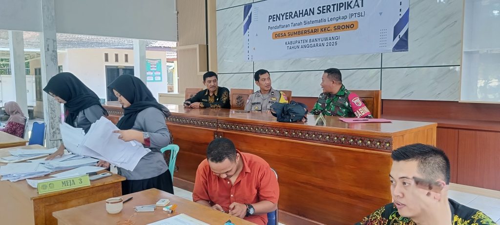 MediaRakyat.co.id | Banyuwangi, 2 Oktober 2025 — Suasana Balai Desa Sumbersari, Kecamatan Srono, tampak ramai pada Kamis pagi. Ratusan warga berkumpul untuk mengikuti acara penyerahan sertifikat tanah melalui program Pendaftaran Tanah Sistematis Lengkap (PTSL) Tahap I yang diselenggarakan oleh Badan Pertanahan Nasional (BPN) Banyuwangi.